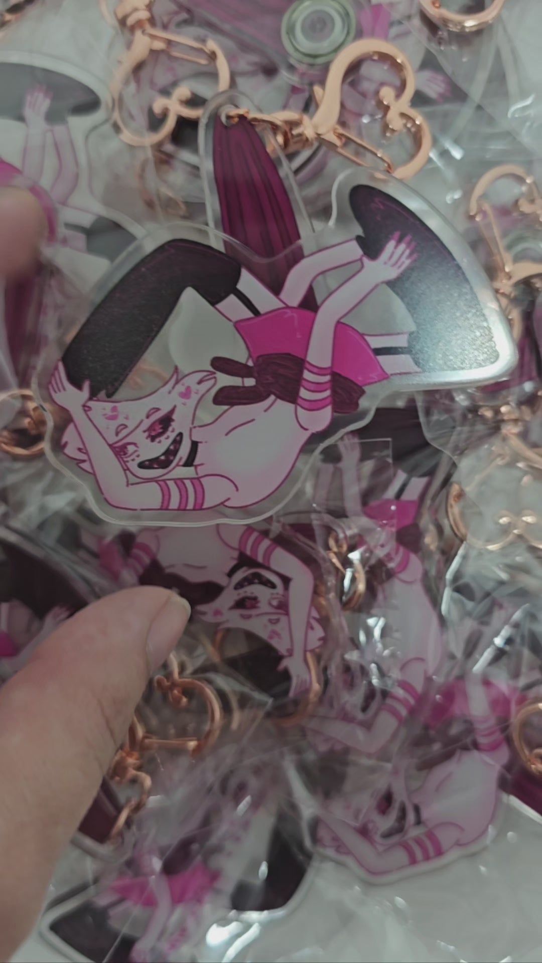 From the popular show Hazbin Hotel comes a Spinner Keychain of Angel Dust! Each Keychain is just over 7cm tall and can spin fully around when clasped to your keys, bag, or phone!