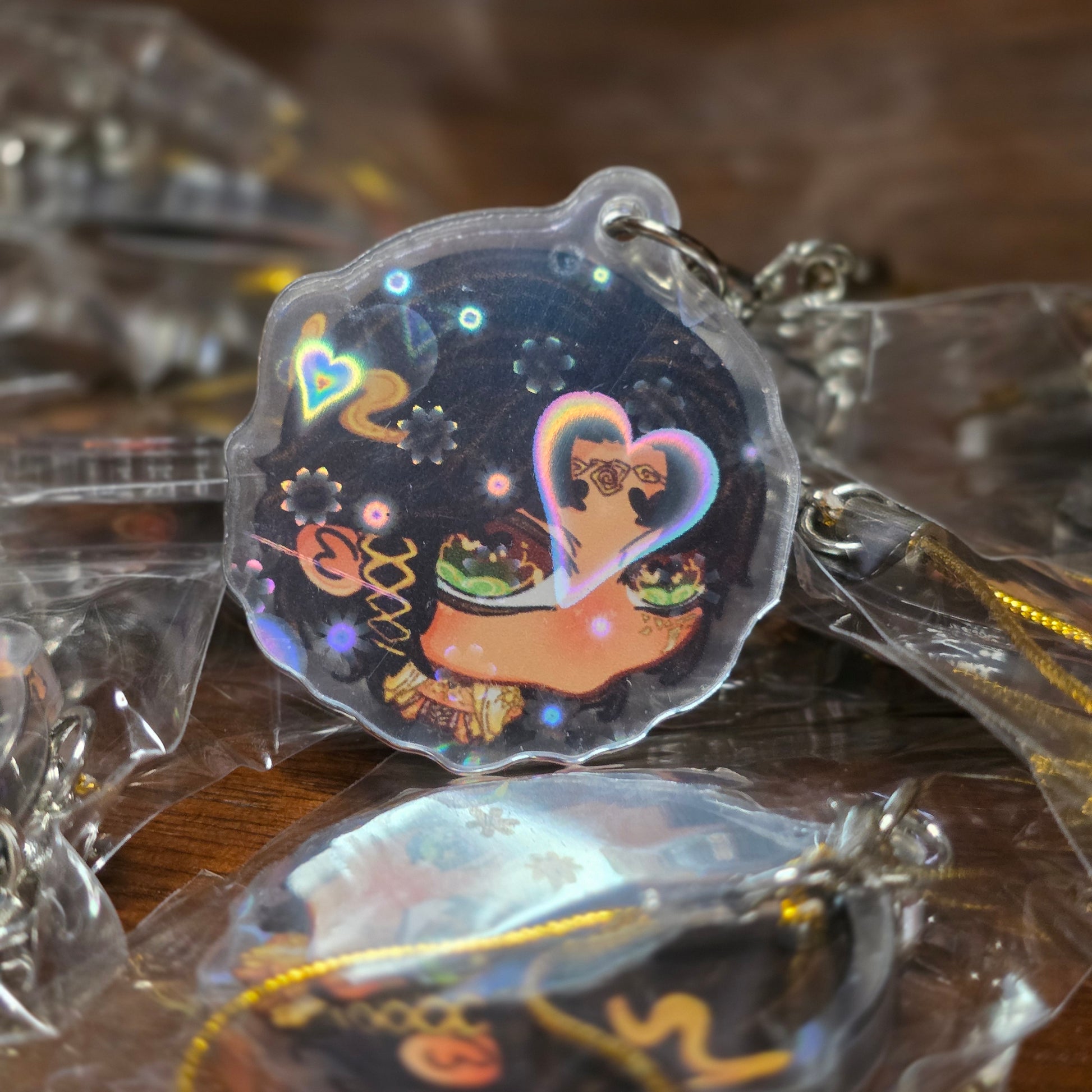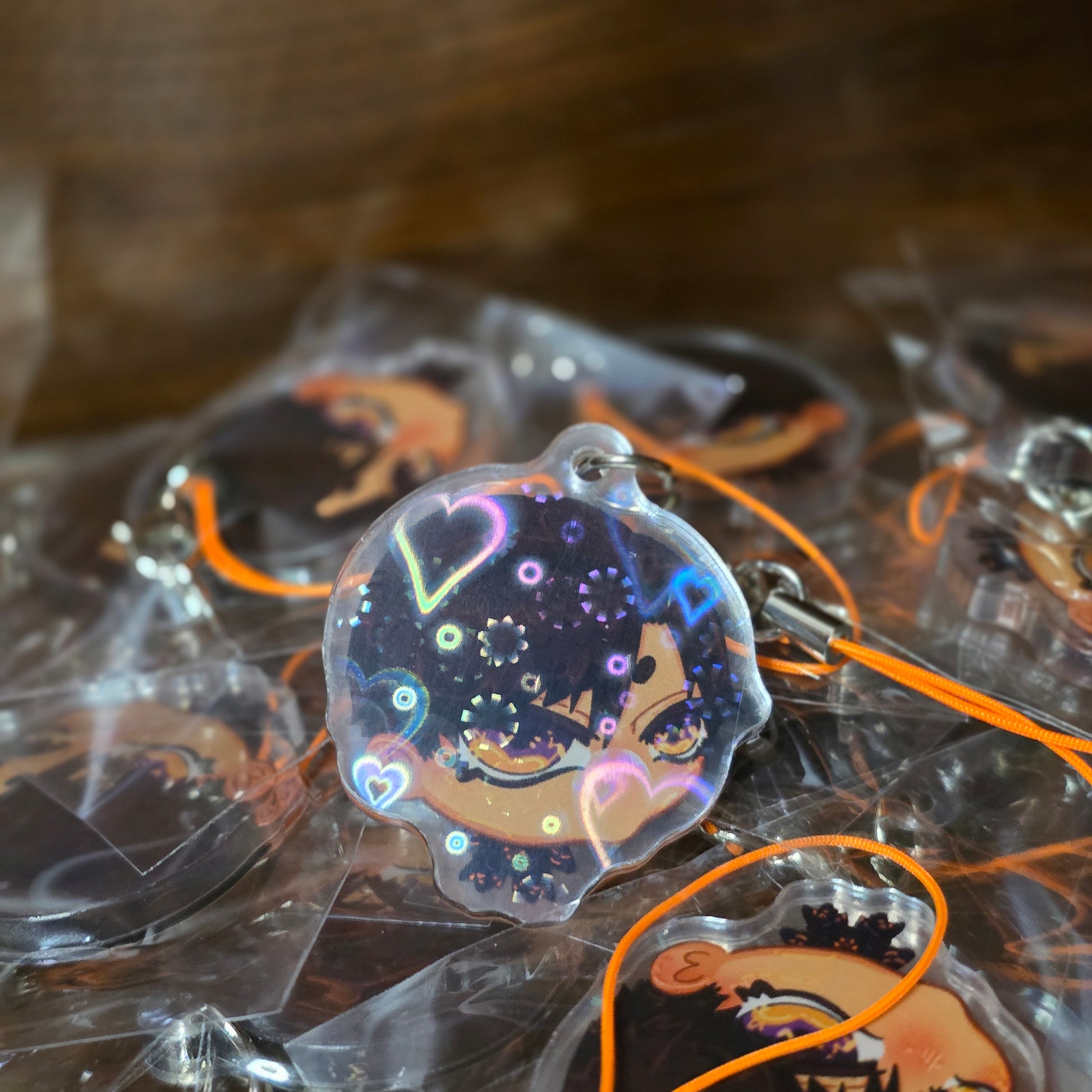 Each charm is about 1.5 inches tall (4cm) with a holographic pattern on one side! they can be attached to a phone or bag using the keychain strap.